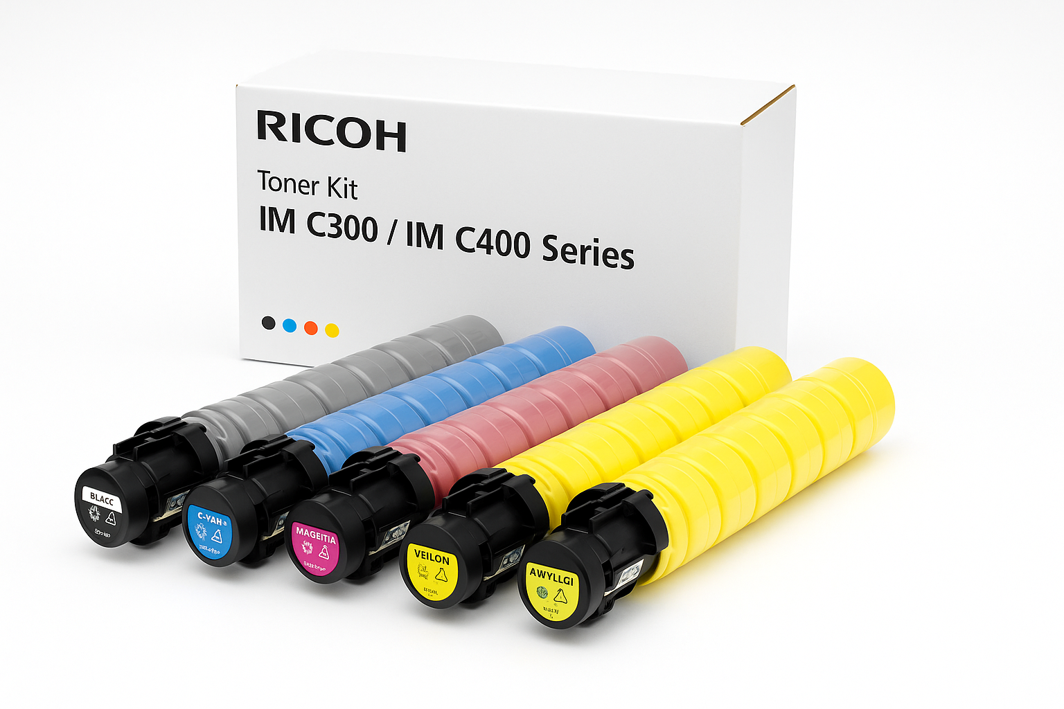 Kit de 4 cartuchos de tóner original Ricoh diseñados para la serie IM C300 / IM C400, que garantizan la mejor calidad de impresión, rendimiento y durabilidad en documentos a color.
